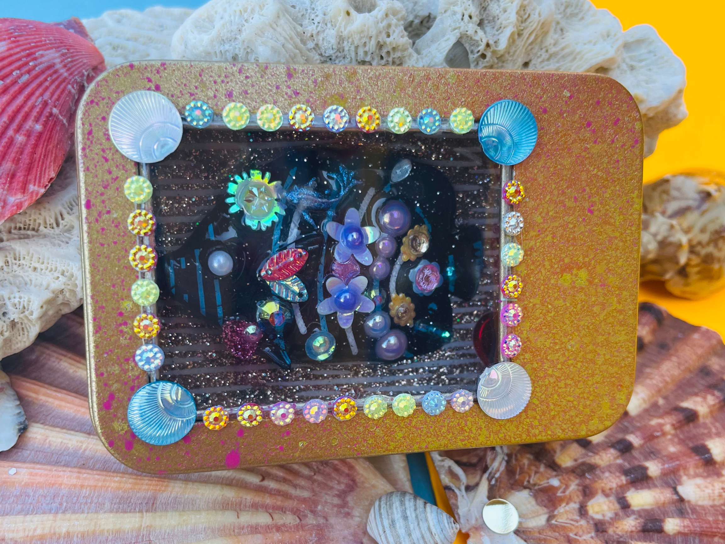 Fabriquées en verre, résine époxy, perles recyclées, sequins et paillettes